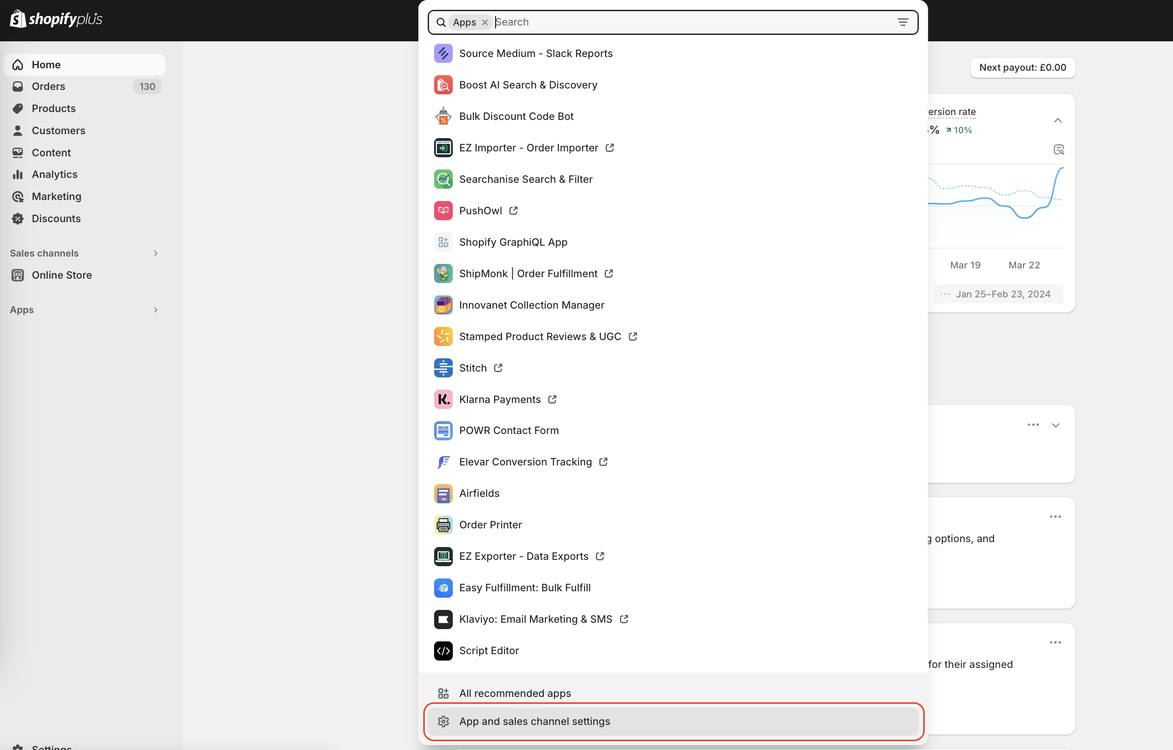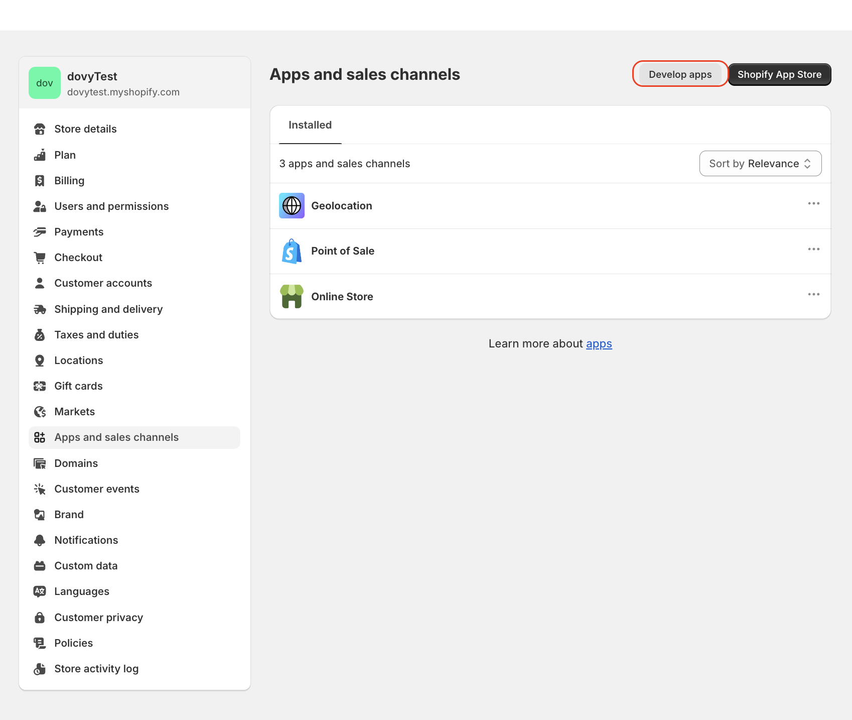 1. In your Shopify store admin section, navigate to Apps and click "**Apps and sales channels settings"** at the bottom.