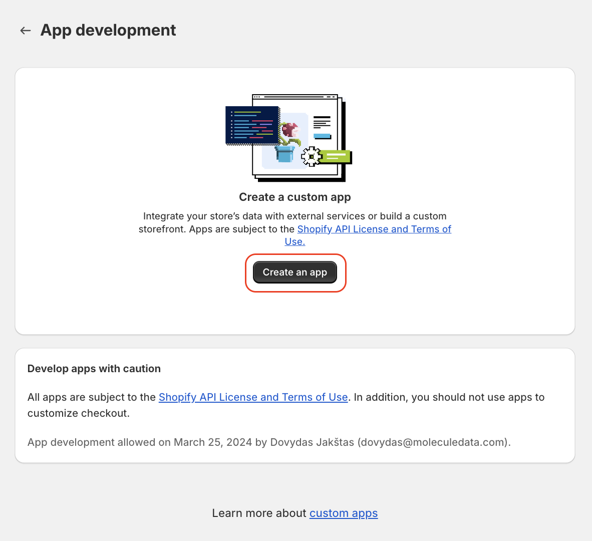 The setup defined below is required to establish connectivity with your Shopify store and Molecule Data tool. This process grants Molecule Data as a custom application so order data can be transmitted to/from Shopify and Molecule Data.