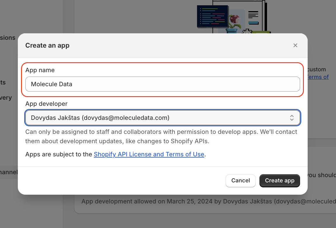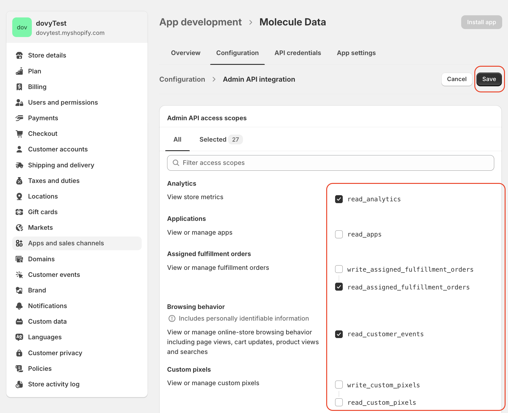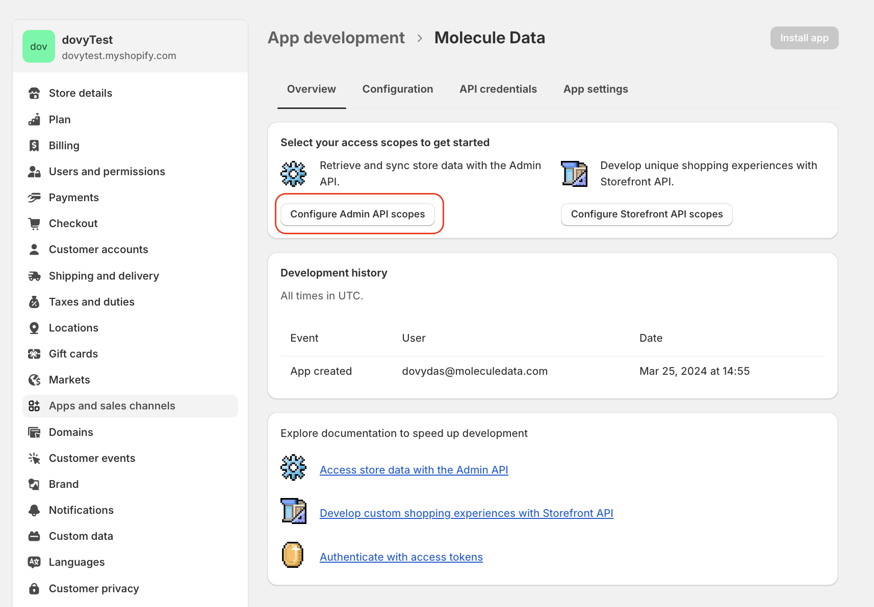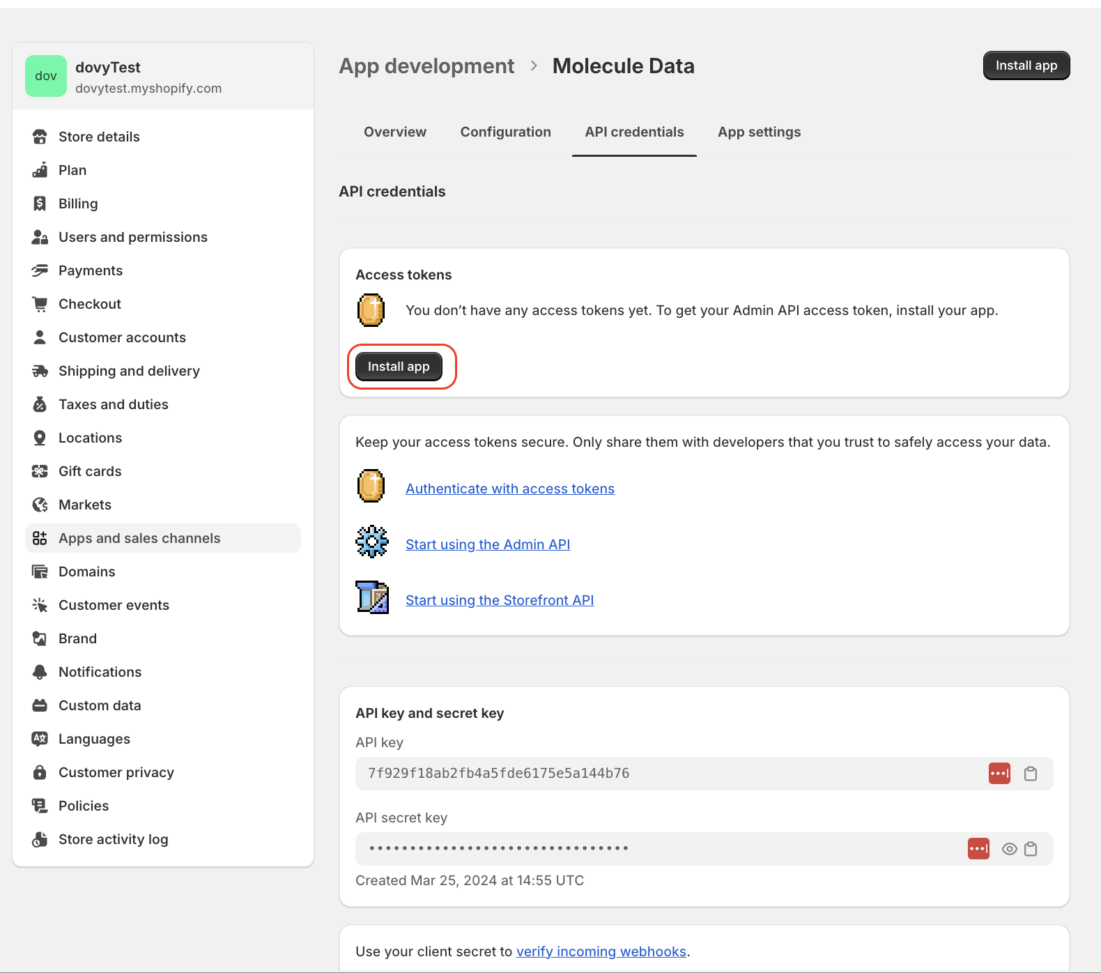 8. Now that your app is ready, you need to **install** the app and **add the provided API keys** into Molecule Data Shopify Integration section.